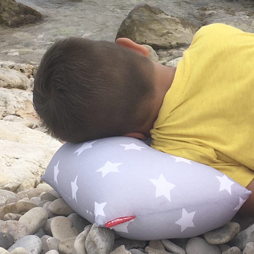 Fet de tela de licra de bany estampada amb àncores blanques sobre fons blau clar i farcit de perles de poliestirè.Fet de tela de licra de bany estampada amb estrelles blanques sobre fons gris i farcit de perles de poliestirè.les cervicals i descansar, és molt còmode i pràctic. No pesa res, menys de 150 g i la seva mida perfectament estudiada per cabre dins d’una bossa de mà el fa còmode, àgil i permet portar-lo a tot arreu