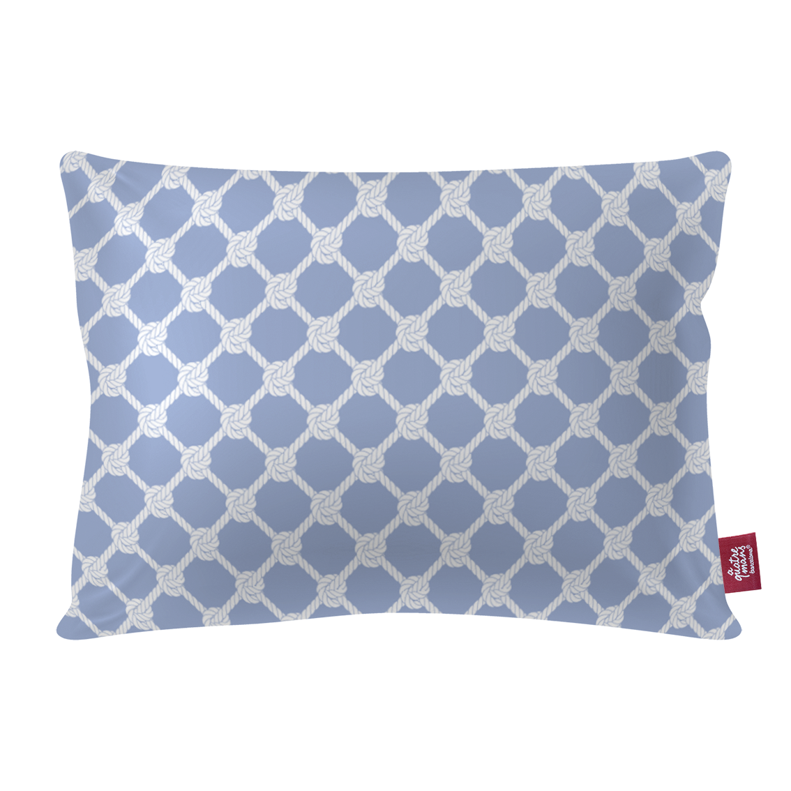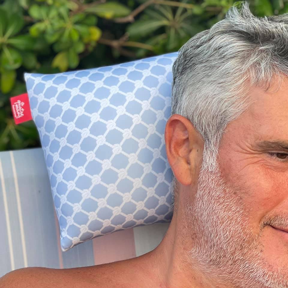 Fet de tela de licra de bany estampada amb nusos blancs sobre fons blau clar i farcit de perles de poliestirè. Es pot mullar i és el complement ideal per a la platja, piscina, vaixell… per recolzar el cap, relaxar les cervicals i descansar, és molt còmode i pràctic. No pesa res, menys de 150 g i la seva mida perfectament estudiada per cabre dins d’una bossa de mà el fa còmode, àgil i permet portar-lo a tot arreu.